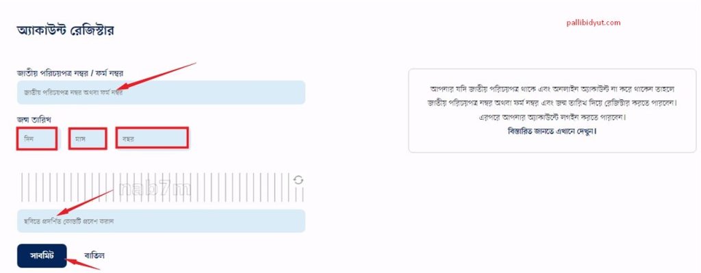 - রেজিস্ট্রেশন অপশনে গিয়ে NID নম্বর/ফর্ম নম্বর, জন্মতারিখ ও ক্যাপচা দিন